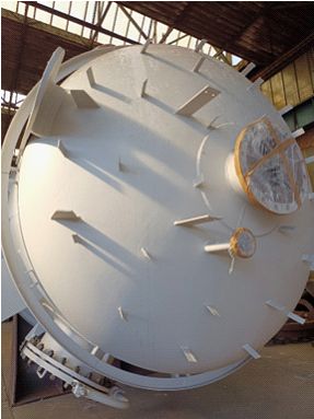 Válcová tlaková nádoba (uzavřená na obou koncích klenutými dny), svisle upevněná na sloupové základně. Aparatura je vybavena průlezem, otvory pro procesní média a otvory pro měření a elektroforézu.